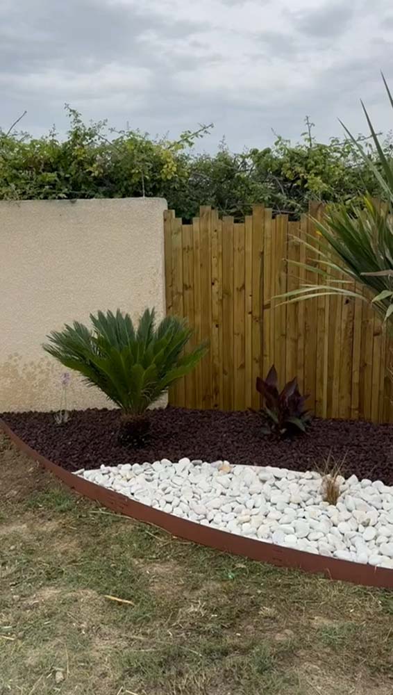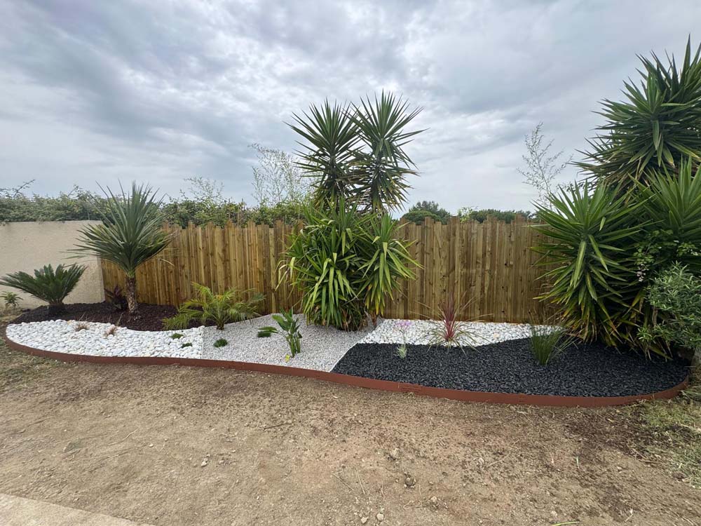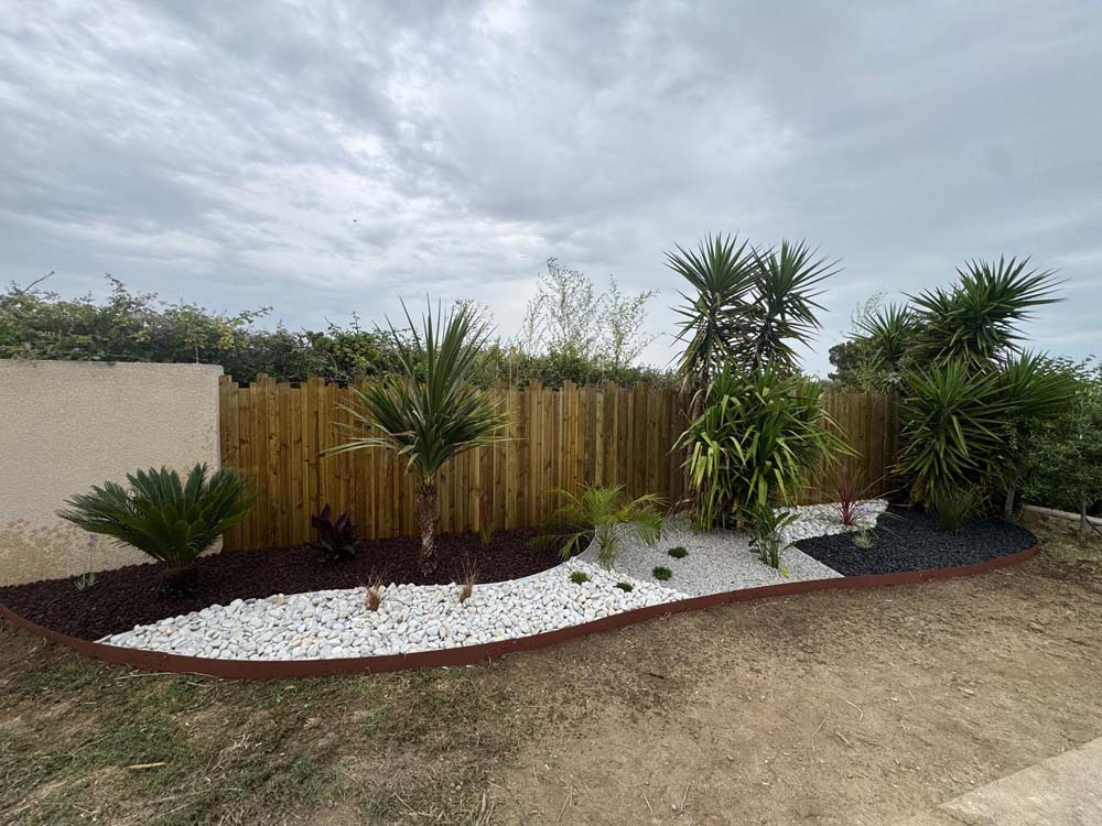 Pour ce client, nous avons posé des panneaux en bois pour délimiter le jardin avec élégance et discrétion. Plusieurs types de graviers ont été installés afin d’apporter texture et contraste au sol, tandis que des plantations exotiques et méditerranéennes ont été choisies pour leur résistance et leur faible besoin en eau, créant ainsi un espace à la fois esthétique et facile à entretenir.