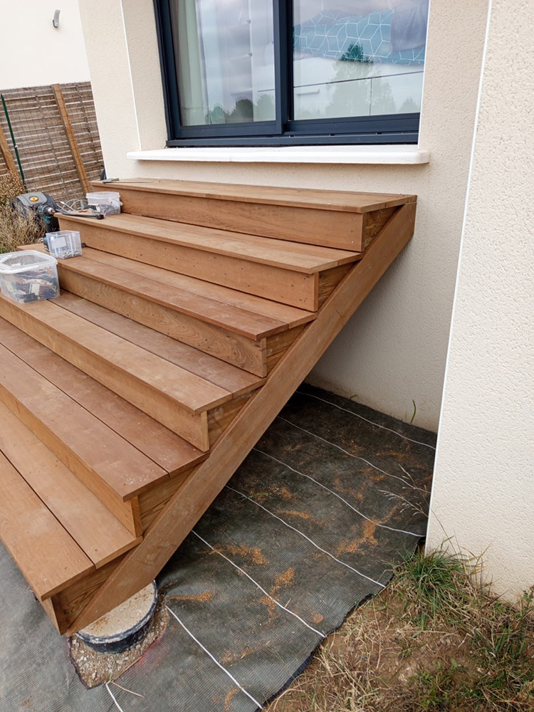 Pour ce projet, nous avons conçu et réalisé deux petits escaliers extérieurs en bois exotique, permettant de relier harmonieusement le jardin aux baies vitrées de deux pièces de la maison. Pensés pour allier esthétisme et fonctionnalité, ces escaliers facilitent l’accès tout en s’intégrant naturellement à l’aménagement extérieur.