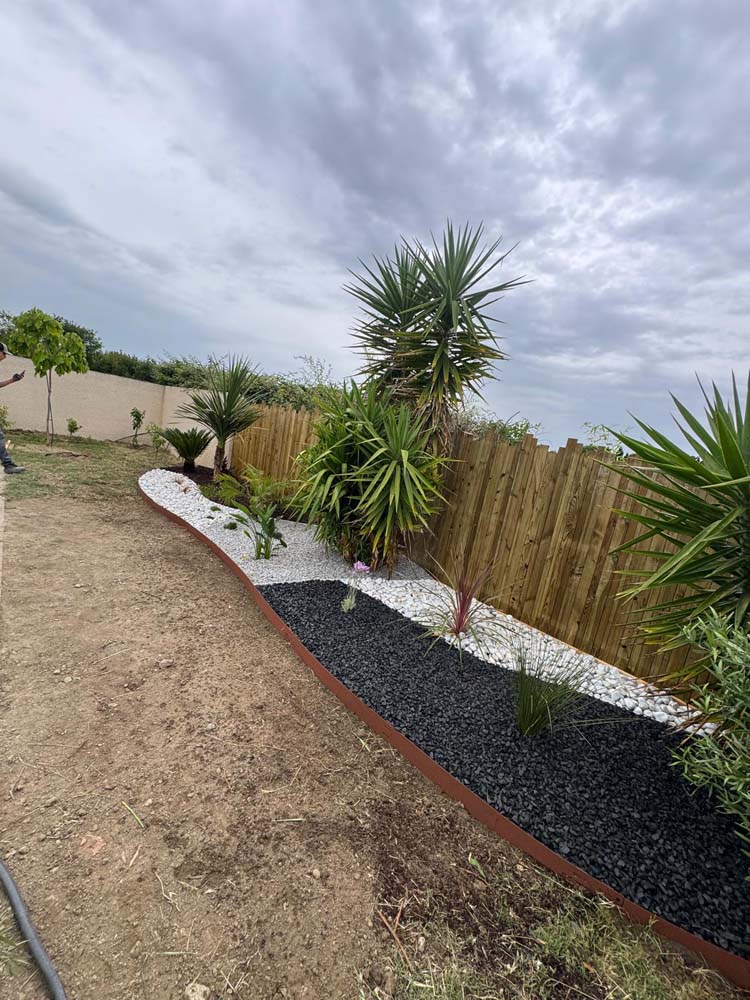 Pour ce client, nous avons posé des panneaux en bois pour délimiter le jardin avec élégance et discrétion. Plusieurs types de graviers ont été installés afin d’apporter texture et contraste au sol, tandis que des plantations exotiques et méditerranéennes ont été choisies pour leur résistance et leur faible besoin en eau, créant ainsi un espace à la fois esthétique et facile à entretenir.