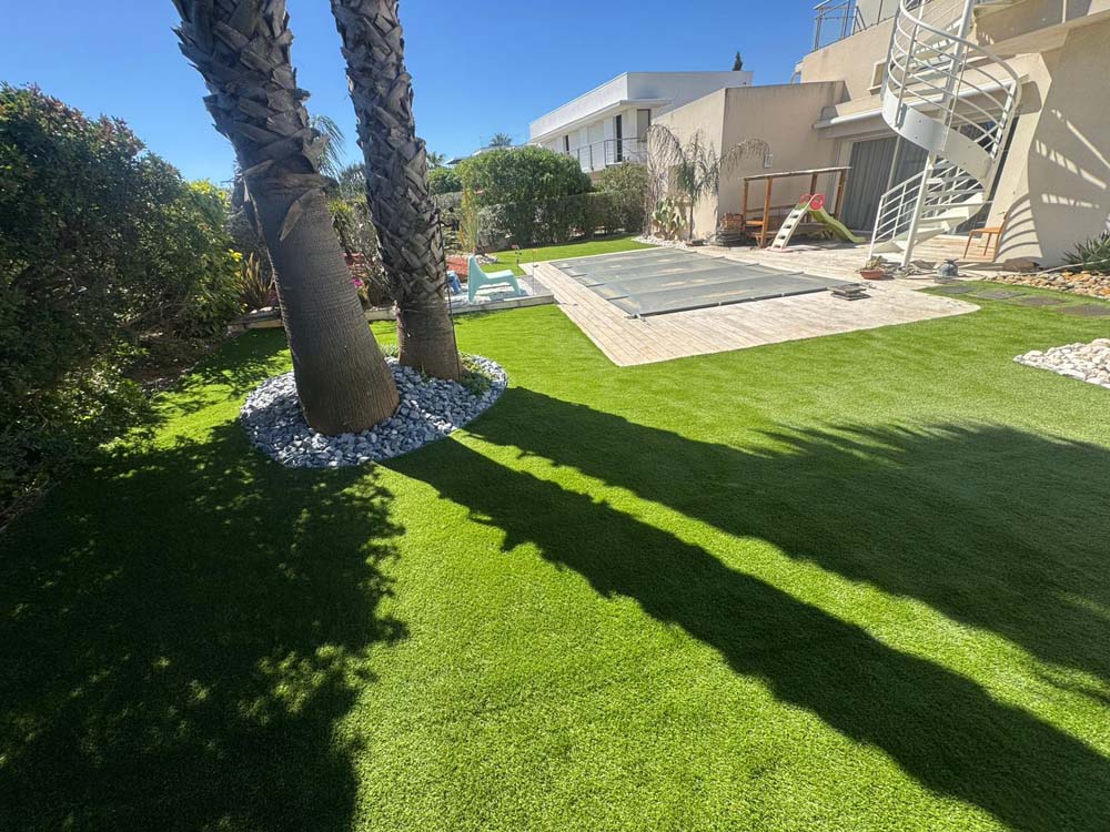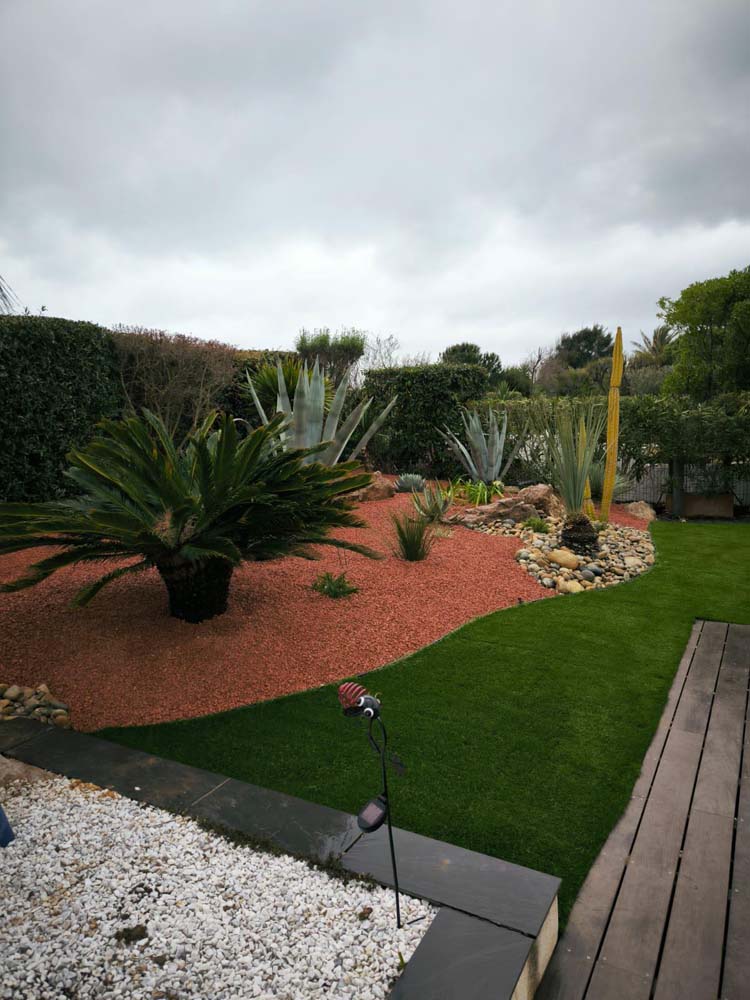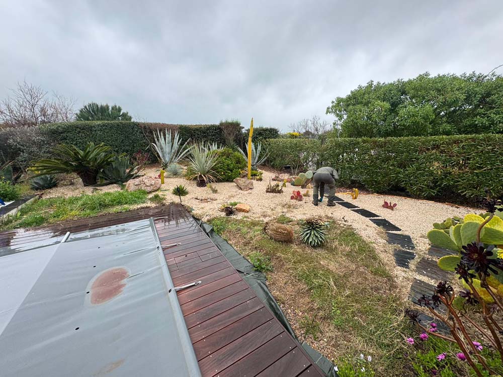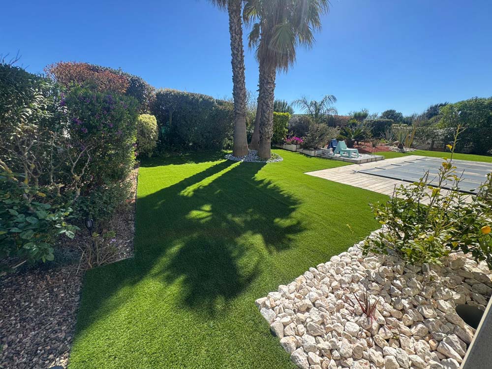 Pour ce client, nous avons opté pour des plantations de cactées et de plantes exotiques, parfaitement adaptées à une demande en eau réduite. Afin de limiter l’entretien tout en gardant un espace accueillant, nous avons installé une pelouse synthétique. Ce choix permet de créer un jardin à la fois esthétique, durable et respectueux des contraintes climatiques locales.